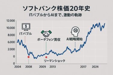 ソフトバンク株価ソフトバンク株価推移を完全分析!20年チャートで見る上昇と下落の理由 ソフトバンク株価の20年推移を完全分析。ITバブル、リーマンショック、AI戦略まで、株価が上昇・下落した理由をチャートと歴史的背景から徹底解説。ソフトバンク株の過去から未来を読み解きます。 2025.11.05ソフトバンク株価
