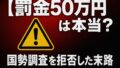 国勢調査の拒否と罰金の判例について解説する画像。「罰金50万円?」のテキストに「判例ゼロ」のスタンプが押されているデザイン。 国勢調査の罰金