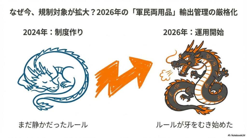- なぜ今、規制対象が拡大?2026年の「軍民両用品」輸出管理の厳格化