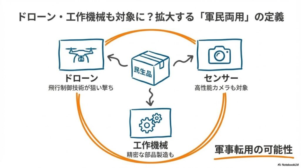 - 完成品の包囲網:部品単体だけでなく、それを含む完成品全体が「軍民両用」扱い。