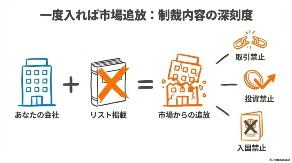 リストに掲載されると、以下のような厳しい制裁が即座に適用されます。