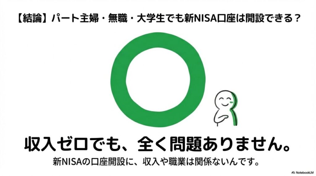 はい、結論から言うと全く問題なく始められます。収入の有無は、新NISAの口座開設の条件ではないんですよ。