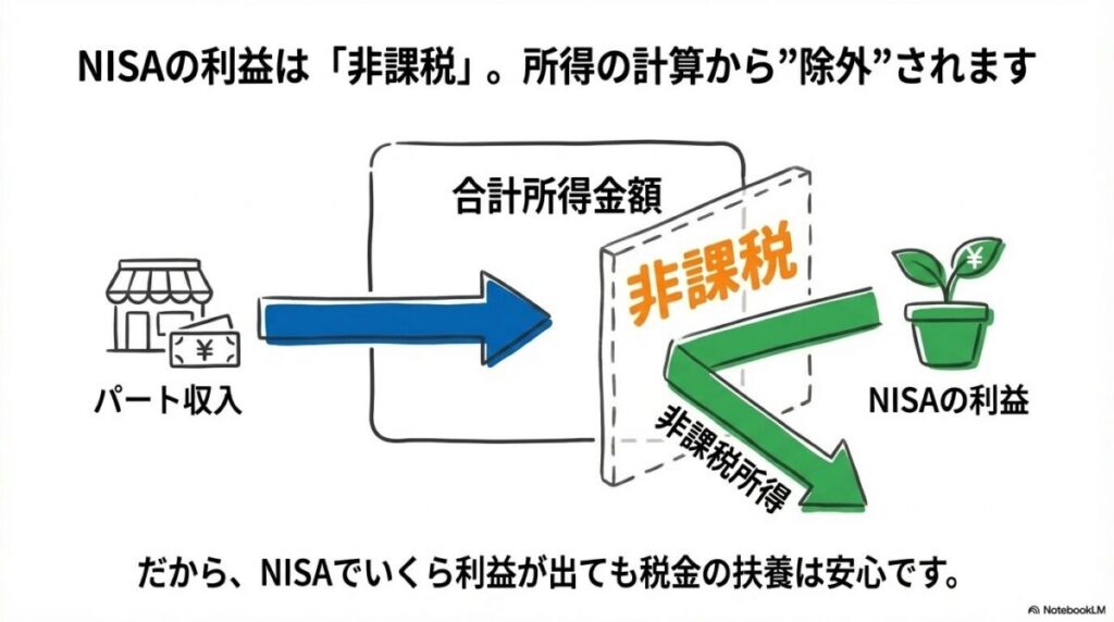 • 税制上の扶養(103万円の壁など): NISAの利益は非課税所得のため、扶養判定の合計所得金額に含まれず、影響はない。