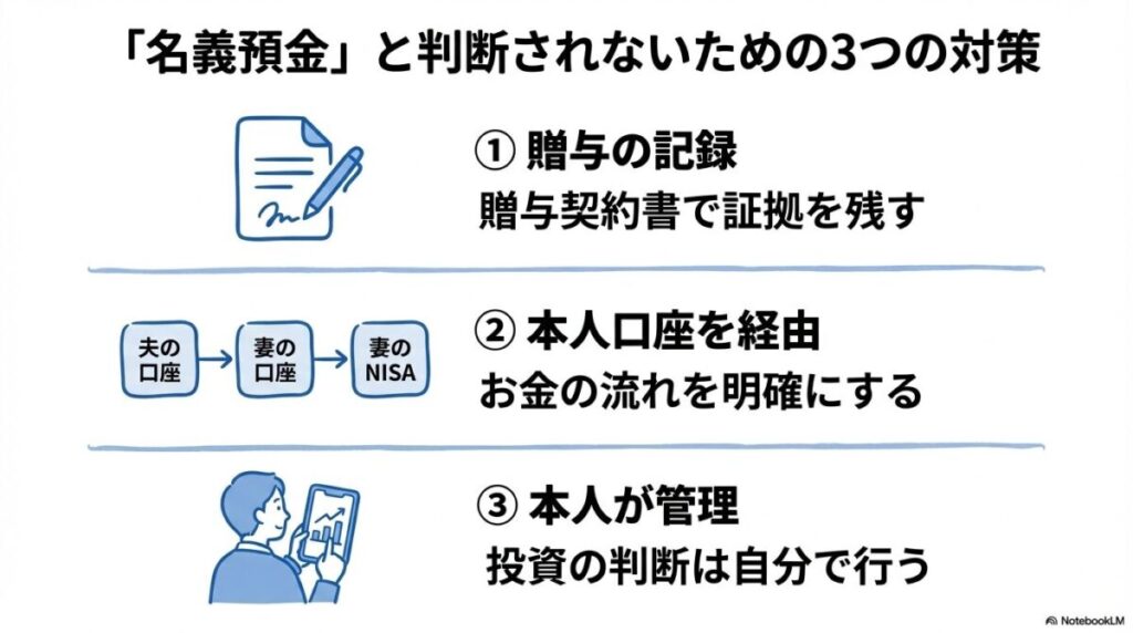 A4: 「名義預金」とみなされるリスクがあるため、避けるべきです。夫の口座からあなたの銀行口座へ「贈与」として資金を移し、そのあなたの口座からNISA口座へ入金する、という手順を踏むことを強く推奨します。