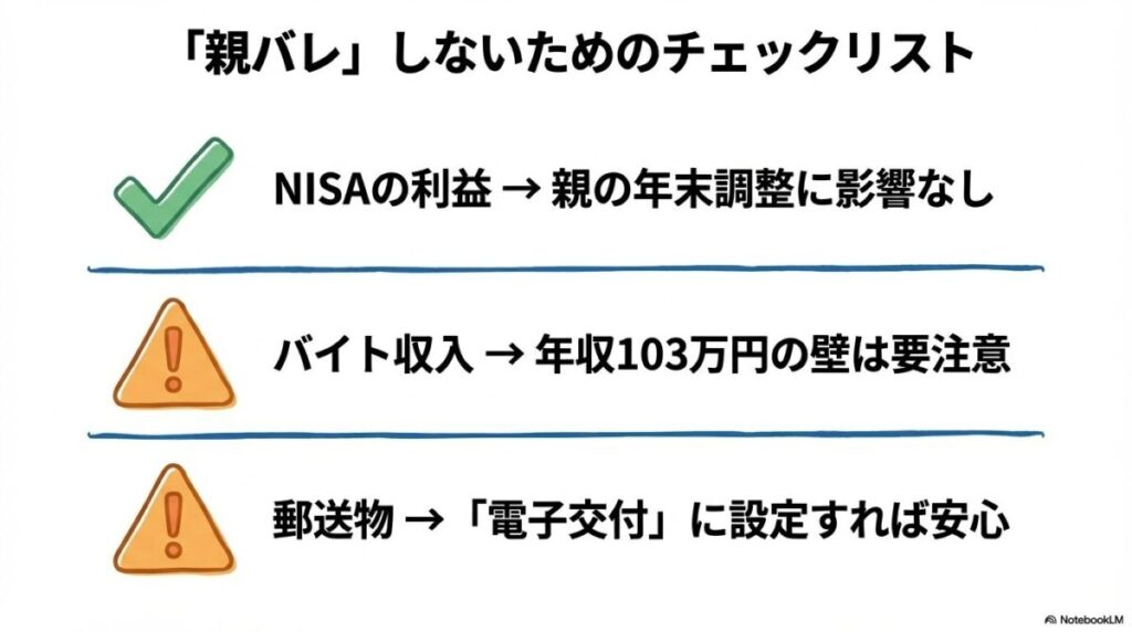 NISAの利益は非課税ですが、アルバイト収入や他の投資(特定口座など)の所得は、扶養判定の計算に含まれます。年間の合計所得が扶養の範囲内に収まるよう、常に意識しておくことが大切です。